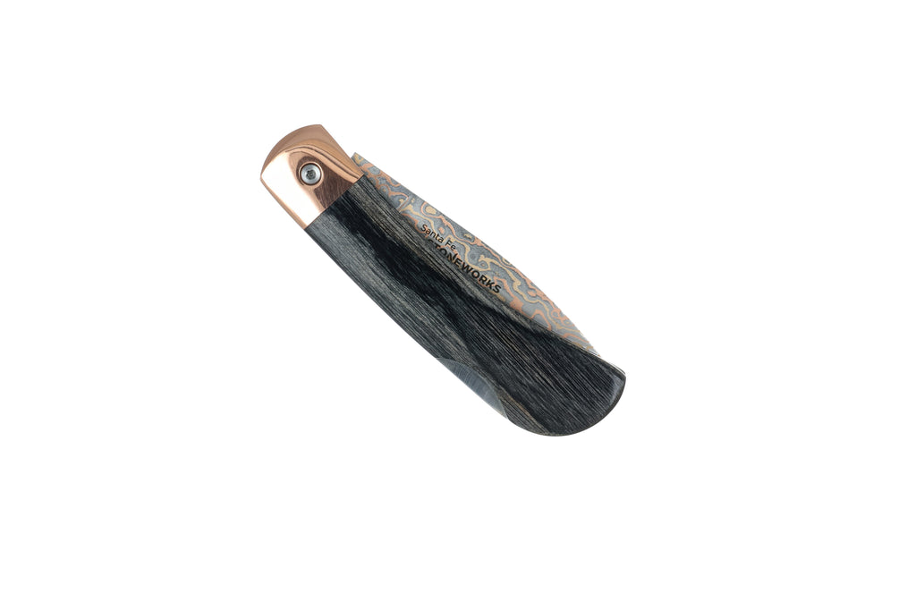 This 3" Lockback showcases Santa Fe Stoneworks’ commitment to precision machining and refined inlay work. Built with copper and brass core Damascus featuring a VG-10 stainless steel cutting core, and finished with solid copper bolsters, this knife blends warm metal tones with striking natural materials for a truly distinctive everyday carry.