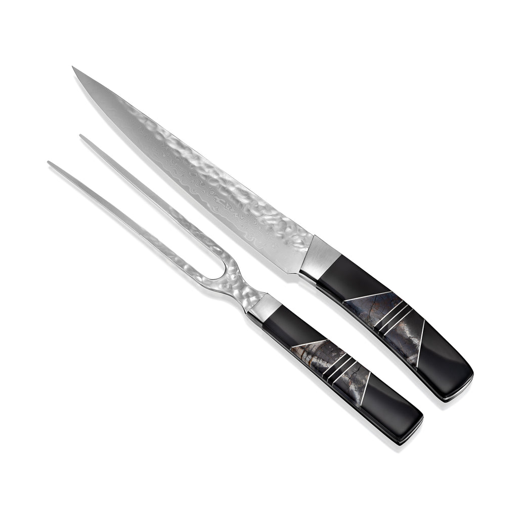 Elevate your carving experience with this exquisite Hammer Damascus Carving Set — a perfect blend of heritage, precision, and artistry. Each set includes a carving knife with an 8-inch blade and a matching carving fork measuring 6½ inches in length, both hand-forged from layered Hammer Damascus steel. The distinctive hammered finish enhances the steel’s striking texture while minimizing drag for clean, effortless slices.