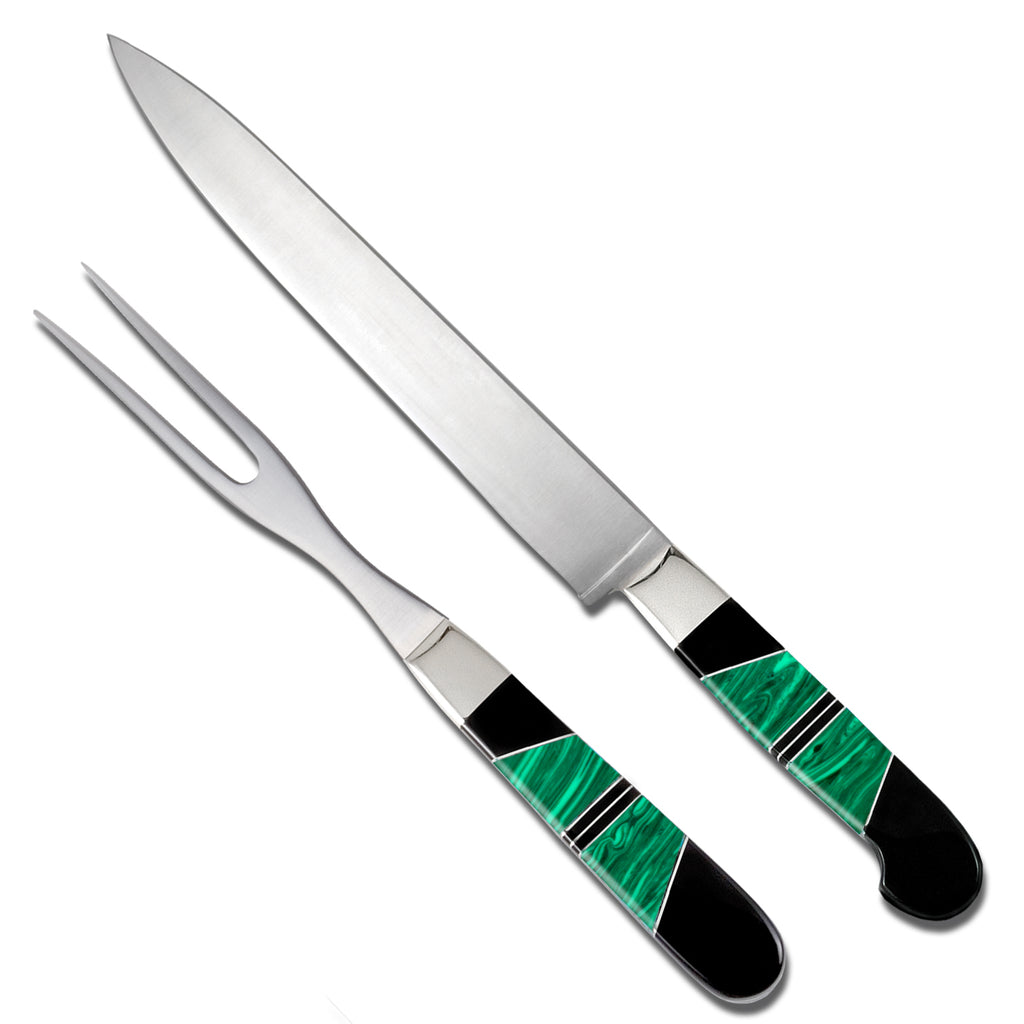 The slicer has a 8 3/4" blade with a handle that is 5" for overall length of 13 3/4". The fork has the same handle with an extension of 5 1/2" for overall length of 10 1/2". The set comes in a form fitted presentation box to store in.