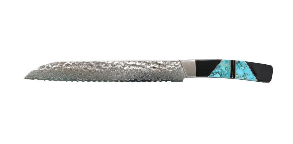 NEW Hammered Damascus Bread Knife with Turquoise, Silver and Jet