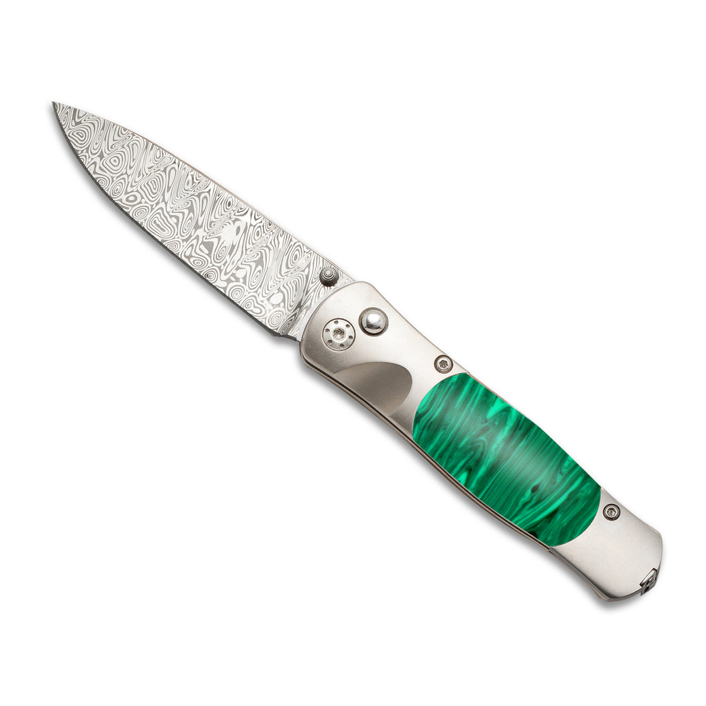This is the second version of the original Santa Fe Stoneworks button lock knife, the “Tesoro”. This model has a Titanium body weighing only 2.3 oz. These Tesoro models feature an Odin Heim Damasteel blade. Damasteel is a forged one-of-a-kind Damascus made in Sweden. It is best known for its excellent edge retention, corrosion resistance, superior edge sharpness and cutting ability. It is also known as the best overall stainless Damascus-patterned steel resulting in a homogenous product. This knife is designed and made with full attention to detail, fit and form.