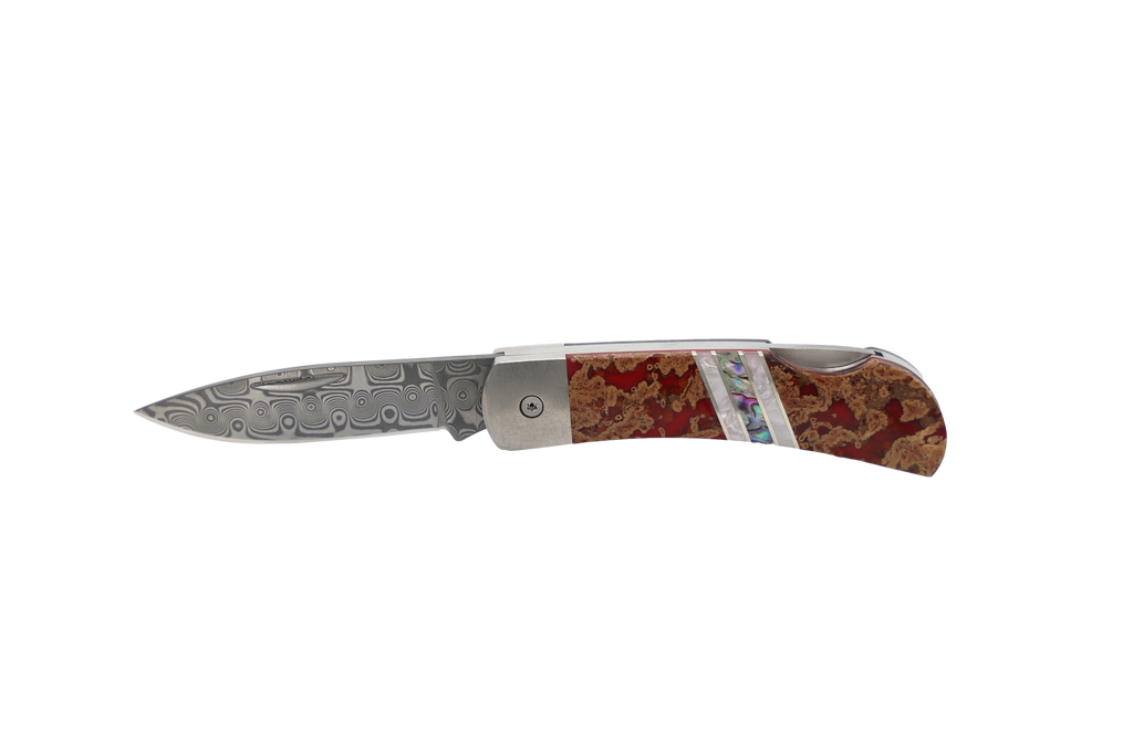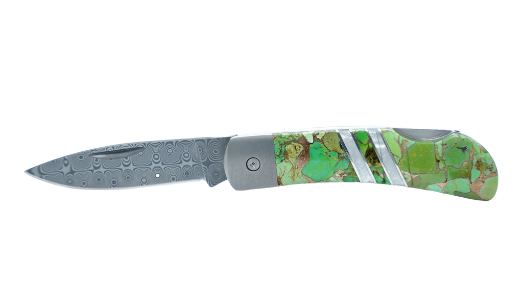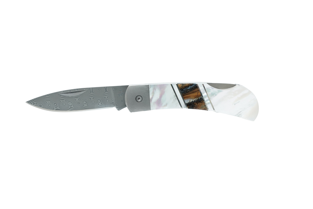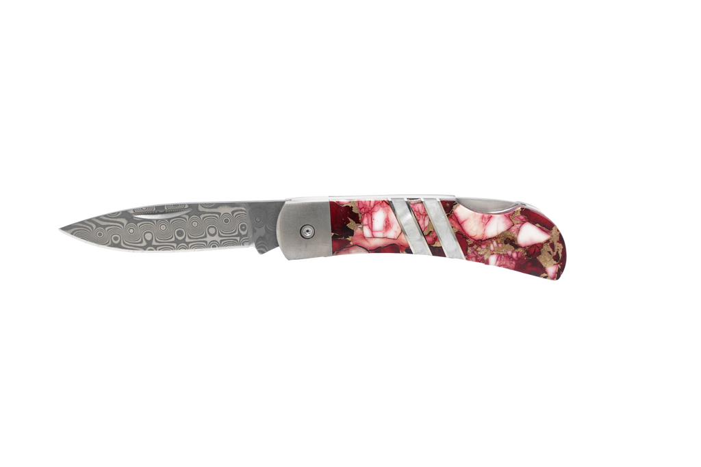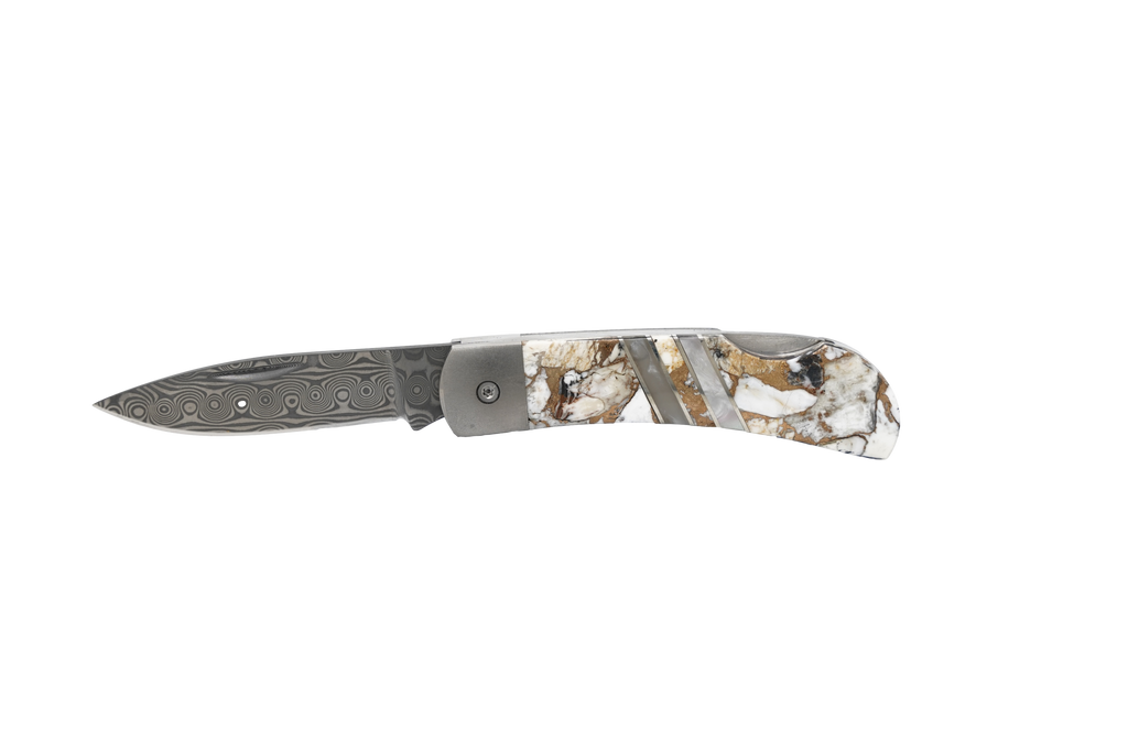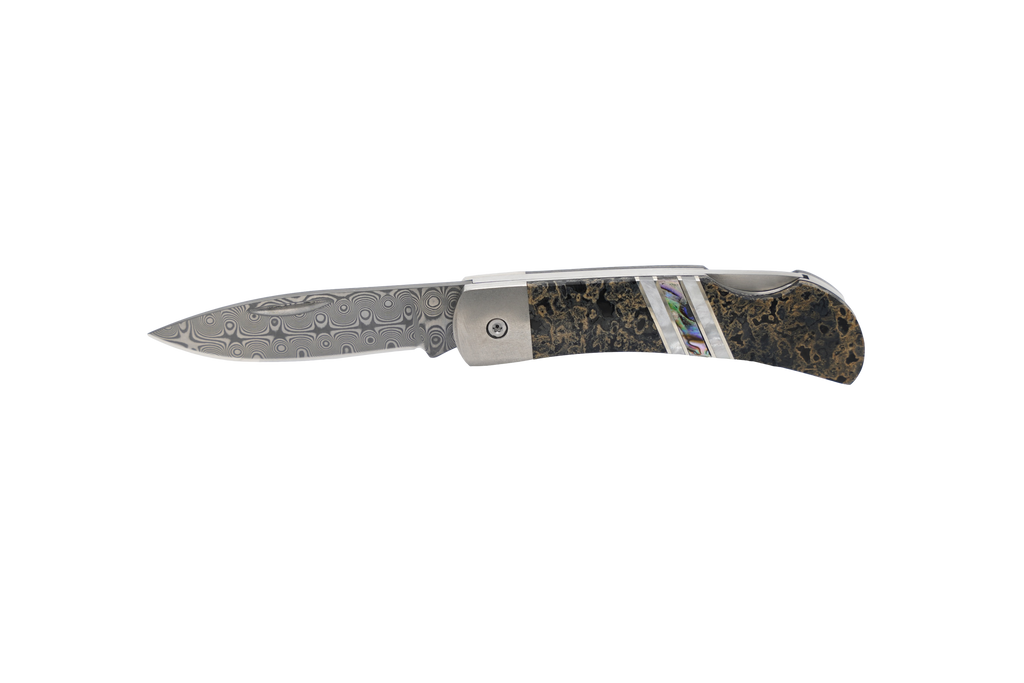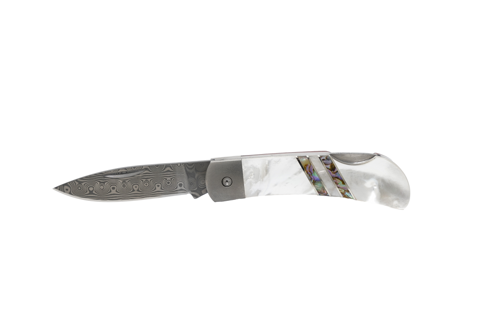 New-Titanium Bolsters and Stainless-Steel body with a 21/4" Damascus steel blade. This Damascus Steel is 110 Layers of stainless steel with a Rockwell hardness of 59-60 and vacuum heat treated. The two steel types that make up the Small Rose Pattern of the blade are 440C and N690 high alloy.