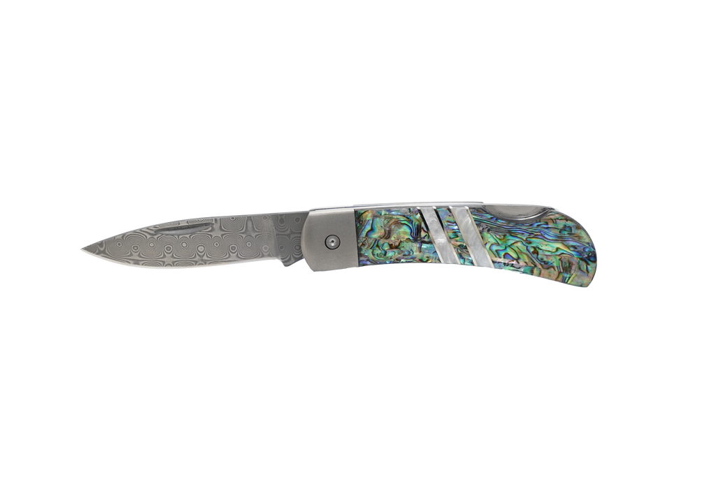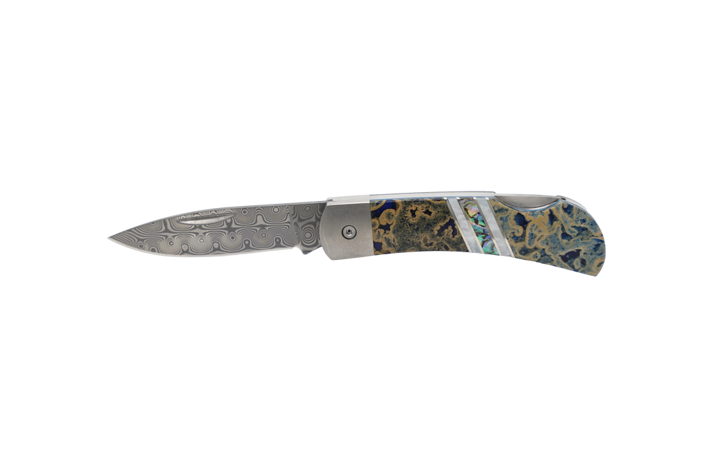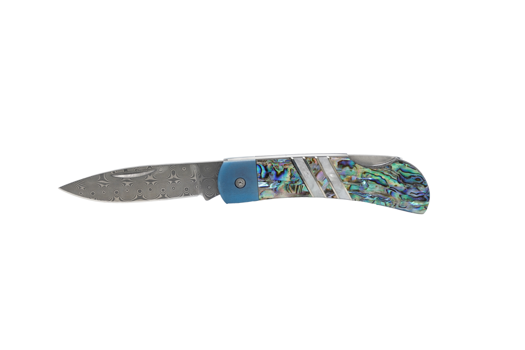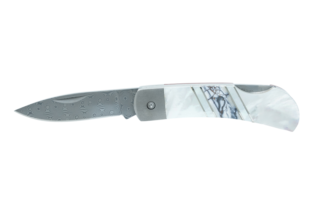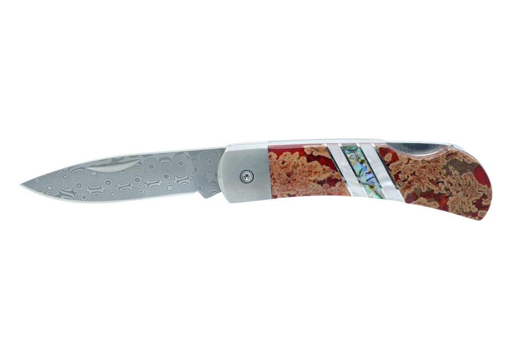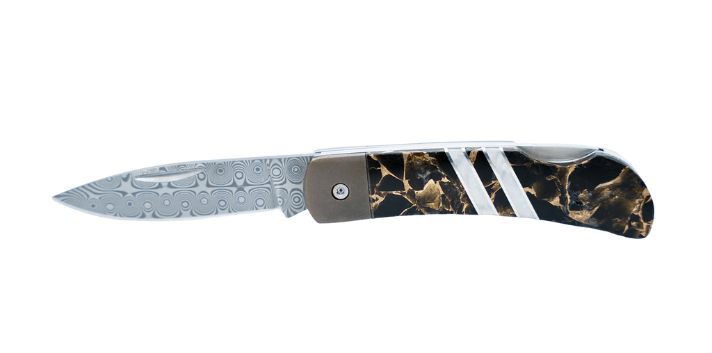 New-Titanium Bolsters and Stainless-Steel body with a 21/4" Damascus steel blade. This Damascus Steel is 110 Layers of stainless steel with a Rockwell hardness of 59-60 and vacuum heat treated. The two steel types that make up the Small Rose Pattern of the blade are 440C and N690 high alloy.