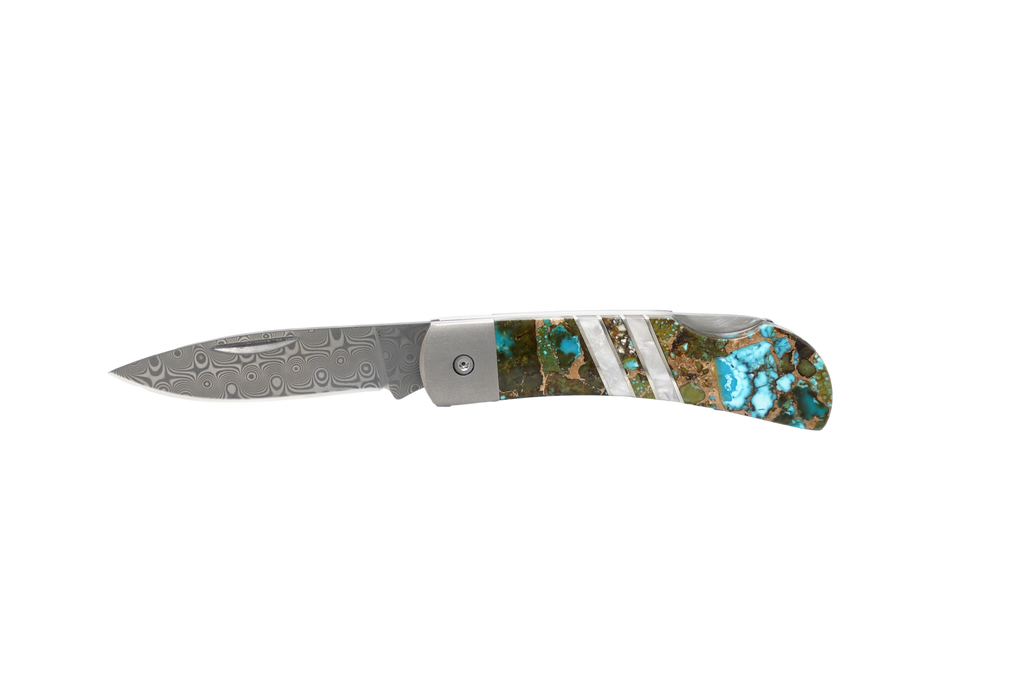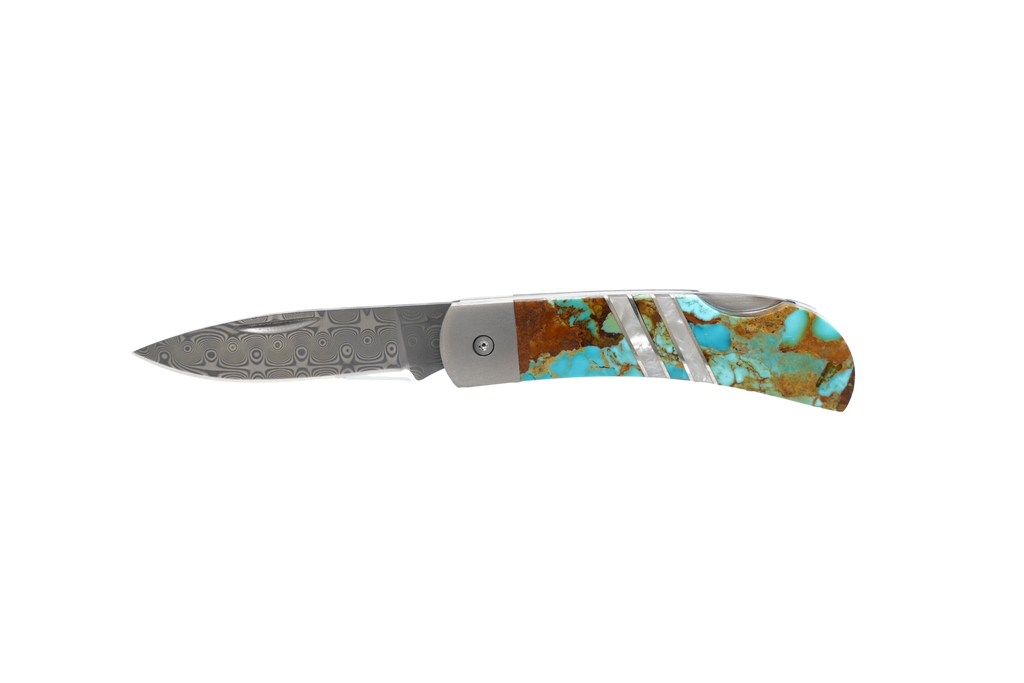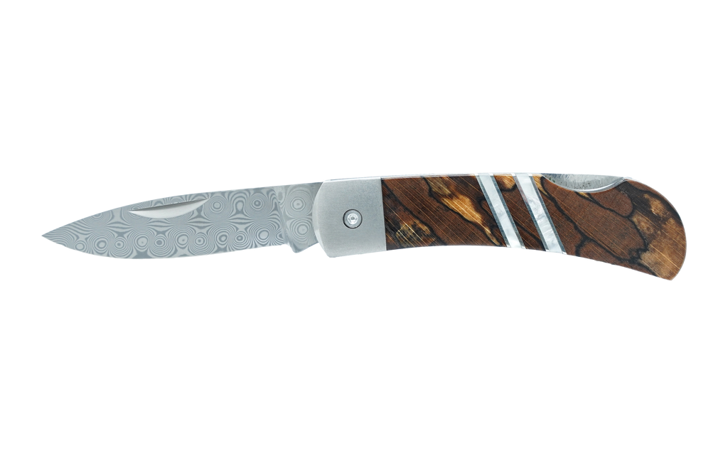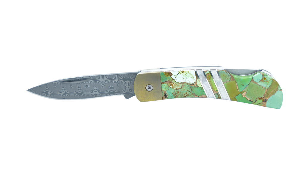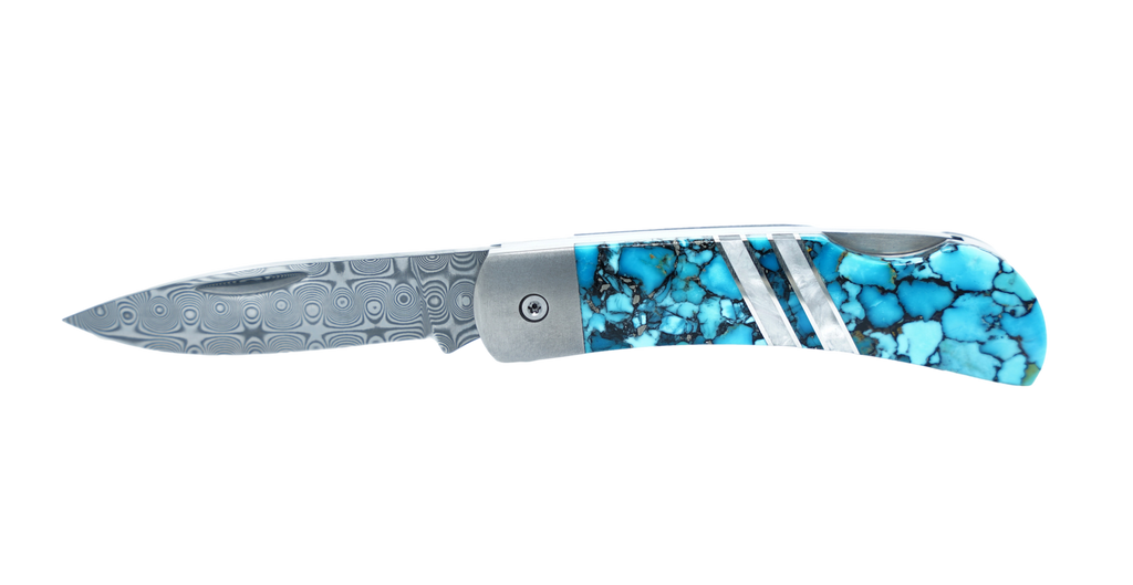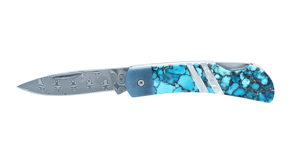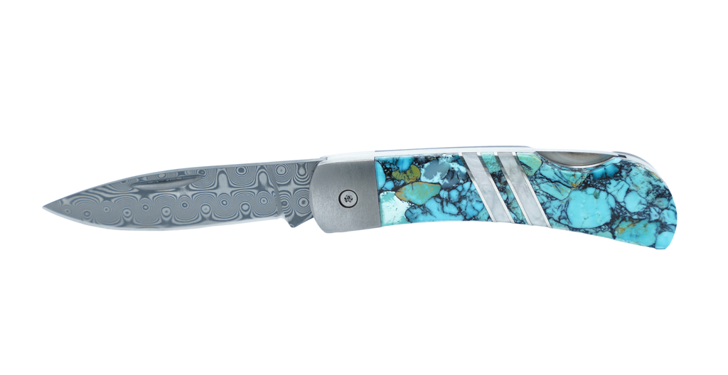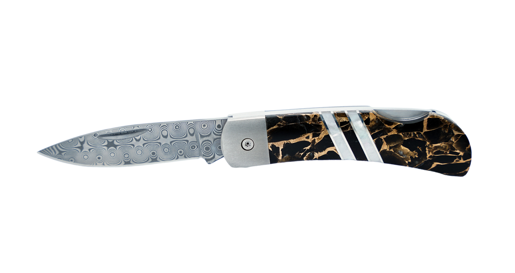 New-Titanium Bolsters and Stainless-Steel body with a 21/4" Damascus steel blade. This Damascus Steel is 110 Layers of stainless steel with a Rockwell hardness of 59-60 and vacuum heat treated. The two steel types that make up the Small Rose Pattern of the blade are 440C and N690 high alloy.
