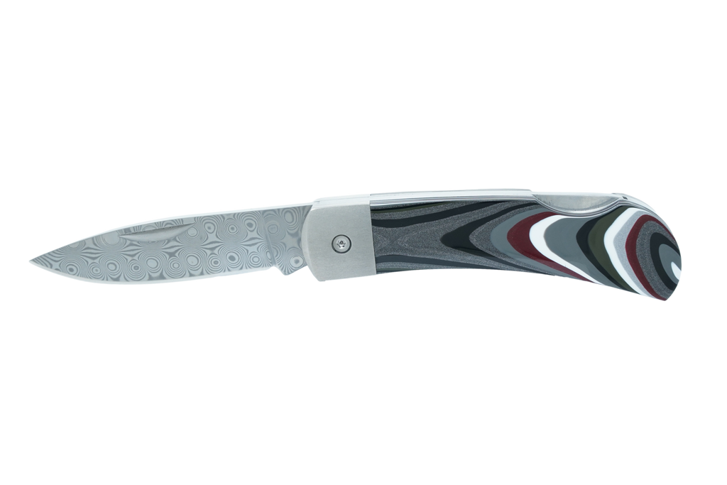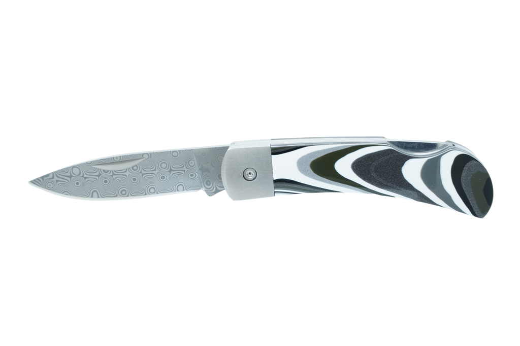 New-Titanium Bolsters and Stainless-Steel body with a 21/4" Damascus steel blade. This Damascus Steel is 110 Layers of stainless steel with a Rockwell hardness of 59-60 and vacuum heat treated. The two steel types that make up the Small Rose Pattern of the blade are 440C and N690 high alloy.